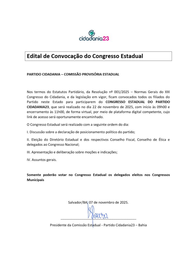 Nos termos do Estatutos Partidário, da Resolução nº 001/2025 – Normas Gerais do XXI Congresso do Cidadania, e da legislação em vigor, ficam convocados todos os filiados do Partido neste Estado para participarem do CONGRESSO ESTADUAL DO PARTIDO CIDADANIA23, que será realizado no dia 22 de novembro de 2025, com início às 09h00 e encerramento às 11h00, de forma virtual, por meio de plataforma digital competente, cujo link de acesso será oportunamente encaminhado.